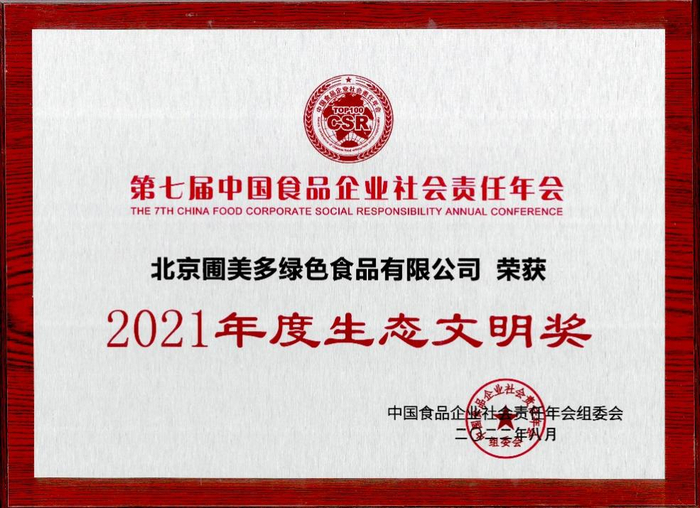圃美多荣获第七届中国食品企业社会责任年会“生态文明奖”