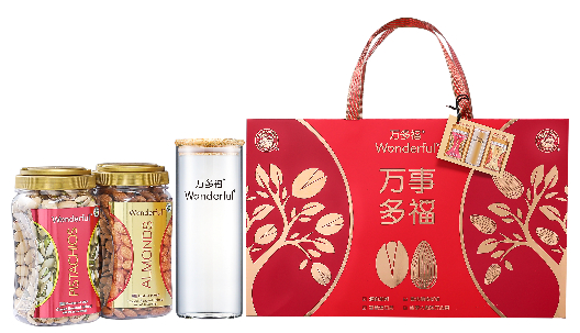节庆送礼万事多福——万事多福礼盒寄托节日祝福,呼应阖家团圆、互道祝福的美好愿景。奢华烫金设计,送礼体面,内含400g盐焗开心果和500g盐焗巴旦木,礼盒内加赠一个万多福®开心果玻璃罐。