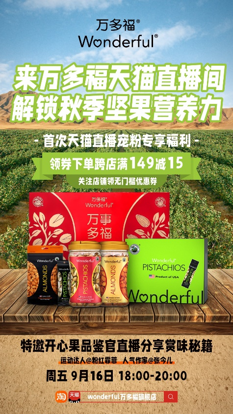 【9月16日,上海】在917坚果健康周期间,高品质坚果品牌万多福®开心果将于9月16日在万多福天猫旗舰店进行首次店铺直播,并携手加州巴旦木协会,共同打造巴旦木“加”年华。直播中,万多福®将带来直播宠粉专享福利,解锁秋季坚果营养力,将开心果带入健康饮食的多元场景中,一起开心过秋季。