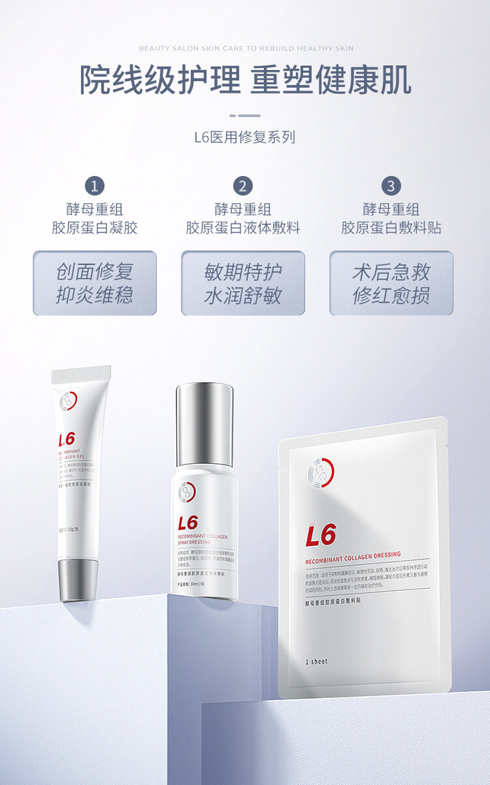 其中,长期戴口罩带来的皮肤问题成为当下消费者的普遍痛点,消费者对修复、抗敏等功能性护肤的需求大大提升。作为二类械字号的功效型医美护肤品牌,「L6」以生物科技、轻医美护肤为切入点,通过细胞修复、DNA研究等生物技术研发多条产品线,覆盖不同护肤周期的护理需求,具备在医院及药店流通的资质。以修复受损细胞为源头,「L6」打造更为适合人体吸收的重组人源蛋白,适用于问题肌肤的修复以及医美术后的肌肤恢复,密集型补充人源蛋白,帮助肌肤恢复健康状态。针对消费者的肌肤难题,「L6」上新医用修复等系列产品,满足广大“爱美人士”的护肤诉求。