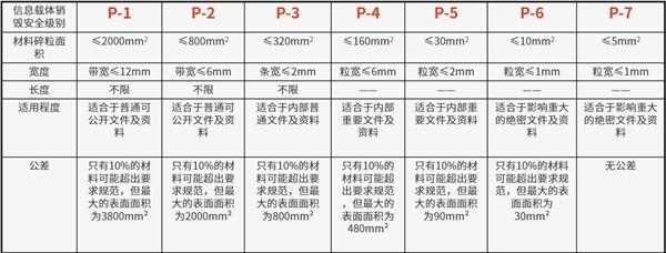 碎纸效果是指纸张经过碎纸机处理后的大小,一般是以毫米(mm)为单位。震旦碎纸机沿用德国DIN66399保密标准,分为七个等级,由低到高依次为:P1、P2、P3、P4、P5、P6、P7,等级越高,碎纸效果越好(见参考图),但碎纸效果越好其碎纸能力会相对削弱。比如低保密需求的家庭和小型办公场所可选用P3、P4级(碎段)碎纸机即可。而保密需求较高的场合可选择P5级(细碎)以上产品。对于高度机密的文件,应采用P7级(粉末)碎纸效果的碎纸机。