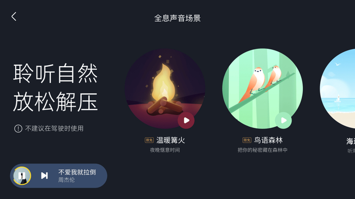 在酷我音乐看来,对用户的陪伴不只局限于音乐本身。通过对出行场景的研究,酷我音乐发现打造沉浸式的声音场景,更有助于帮用户消解驾驶中产生的烦躁、疲劳等负面情绪。由此,酷我音乐车载6.0版本着力打造了全息声音场景,通过5.1环绕声音乐营造出森林中、篝火旁、大海边等自然场景的氛围,每一个场景都由酷我车载声音实验室精心设计,效果极其逼真。这一功能还能与汽车厂家深度合作,结合其智能座舱需求,共同打造更多定制化的场景模式。