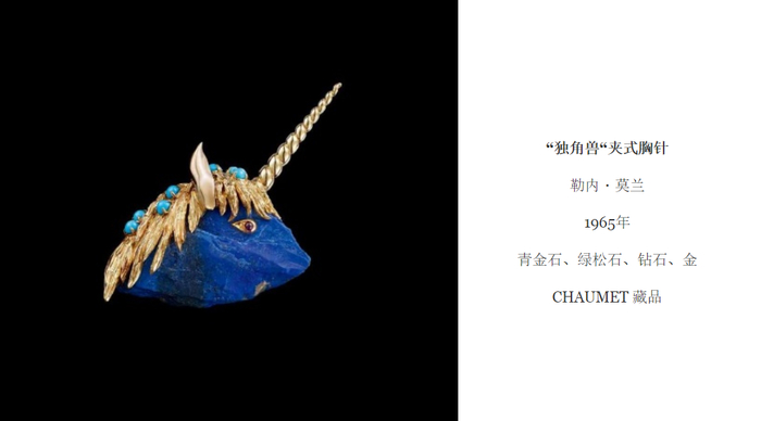 优雅的“蜂鸟”和激烈的“鹰蛇斗”,体现了叙事风格和动物品种的不同,但都是基于真实自然界的创作。除此之外,CHAUMET还运用无尽的想象力去呈现神话中的动物。1965年,勒内·莫兰他创作了“独角兽”夹式胸针。在他眼中,这一小物件象征着创意的一个转折点。设计灵感来自用一块状如这种神秘生灵头部的青金石原石。此外,独角兽是一个他多次演绎的主题。他最早创作的珠宝作品中有一件青金石独角兽座钟,其鬃毛以海蓝宝石和钻石镶嵌而成。——如此特别的神话动物作品,亦有独特的主人。摩洛哥国王哈桑二世拥有它。