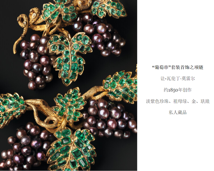 巴尔扎克在描述他笔下一个人物所佩戴的头饰时,写道:“一串最出色的手工雕制的煤玉葡萄,是在弗森处定制的,价值一千埃居⋯⋯那叶子是冲压的铁片,薄得就像真的葡萄叶子一样。手艺人还没忘记雕上弯曲有致的葡萄树的卷须,刚好扣在发卷上,就像依附在葡萄枝上一样。”