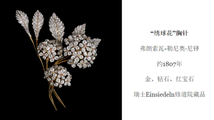 对于客人而言,珠宝的最终抵达之处,绝多大多数时候都是情感。CHAUMET在为约瑟芬皇后之女奥坦丝王后(Queen Hortense)打造作品的时候,十分周到地考虑到这对母女之间——准确地说,两位皇后之间,需要在CHAUMET这里获得题材上与风格上的内在延续性。众所周知,绣球花是约瑟芬皇后最喜欢的花园植物之一,而绣球花的法语“hortensia”发音与Hortense的名字恰好谐音,于是,这枚为“女儿”而作的胸针便顺理成章、令人动容、又充满惊喜地取材这种花卉。与此同时,约瑟芬一生所拥有的CHAUMET珠宝大多具有谦逊、细腻、优雅的风格,这枚胸针也完美地“继承”这一特点,忠实还原了绣球花的厚重感,无限接近真实自然。