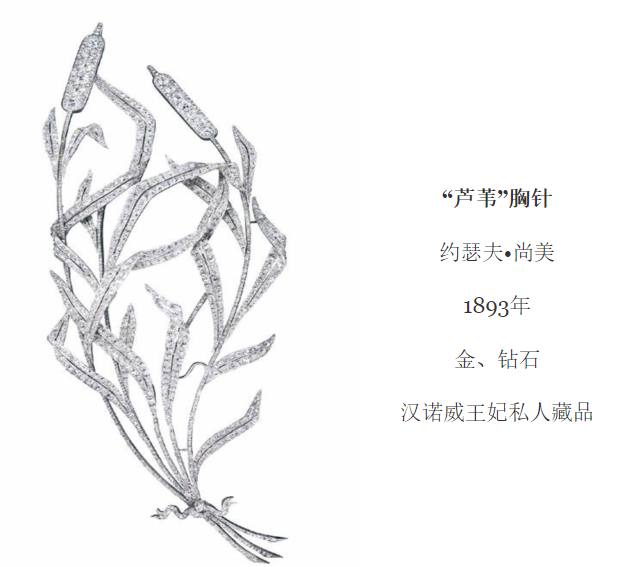 这件用于紧身褶裙(也称“紧身胸衣”)的装饰,从尺寸到造型皆超凡出众,成为十九世纪末自然主义珠宝的一大杰作。CHAUMET逼真地再现了芦苇枝自由舒展,叶片自然弯折的状态,仿佛在风中摇曳,由一根小小的链索系在一处,栩栩如生的一束芦苇胸针便由此诞生。在“美好年代”时期,芦苇作为金银器中反复出现的主题,备受世人青睐。翻开珠宝艺术史,十九世纪末自然主义创作的篇章里,你会发现这件作品,因其从尺寸到造型皆超凡出众,显得如此出挑。