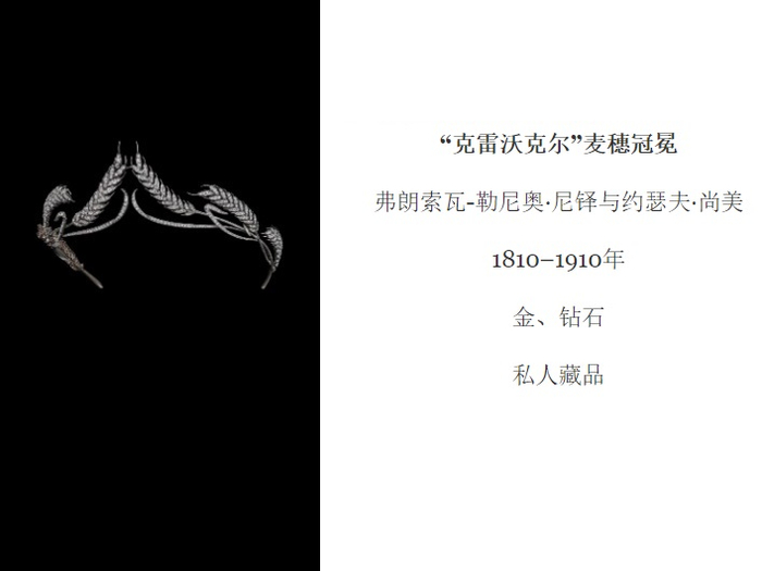 在遵从时代审美的新古典主义创作之外,尼铎还用植物完成了众多超出时代审美的作品。这顶“麦穗” 冠冕便是绝佳的例子,该冠冕在摆脱了新古典主义所追求的对称式设计之外,同时非常大胆地描摹了植物的动态自然场景,而非静态的植物本身——风吹麦浪,九株麦穗互相依偎的画面,惟妙惟肖地呈现于这顶冠冕之上。