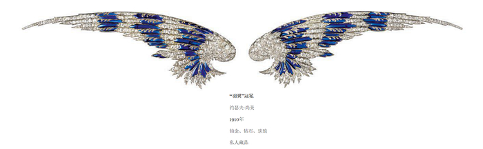 佩恩・惠特尼夫人于1910年7月6日在纽约购买了这件这对羽翼上镶嵌了566 颗钻石及708颗玫瑰式切割钻石珠宝的作品。她是美国20世纪初最具影响力的人物之一。1896年她与哈利・佩恩・惠特尼结婚后,将自己家族的巨大财富带到夫家,投资标准石油公司的生意。夫妻二人强强联手,纵横四海,无人能及。她热爱珠宝,大力支持文化艺术,是纽约惠特尼美洲艺术馆的创始人。她是CHAUMET在“美好时代”美国富豪顾客的代表。