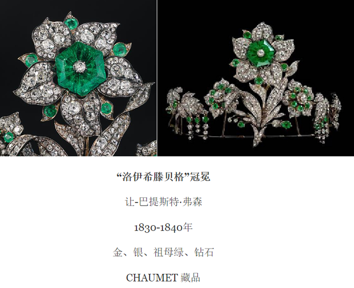 答案当然是否定的。这顶冠冕,来自洛伊希腾贝格家族,是约瑟芬皇后的直系后裔。它由可拆卸的八部分组成,金银质地托架上共镶嵌698颗钻石和32颗祖母绿,中央花朵的花心是一颗近13克拉的六角形哥伦比亚祖母绿,充满一种谦逊与尊贵并重的质感(这种反差的结合也是法国贵族的特质)。这件佳作完美演绎了弗森(Jean-Baptiste Fossin)的自然主义风格,并拥有CHAUMET世家引以为傲的两大特色——多用途转换和可颤动式宝石镶嵌。冠冕上的每朵花饰均可拆下,用作发饰或胸针,而且都能随着佩戴者的移动而微微颤抖,仿佛被赋予了生命,优雅而灵动。我们可以想象,家族中的每一代,每一位都拥有自己的佩戴方式,也因此,这件作品仿佛拥有无穷的生命力。