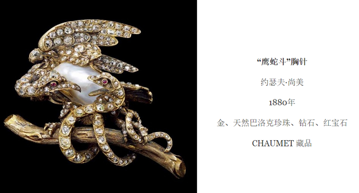 十九世纪以来,雀鸟护巢抵御爬行动物侵袭的主题一直颇受青睐,而鹰与蛇的争斗则代表着天与地的较量,天使与魔鬼的抗衡。CHAUMET呈现了雄鹰与蟒蛇争斗的动态场景,精心雕琢的金饰纹凸显鹰蛇争斗的激烈与强悍。与此同时,光泽皎洁的巴洛克珍珠、美轮美奂的钻石和红宝石又为这款胸针平添了一份梦幻般的神奇色彩。