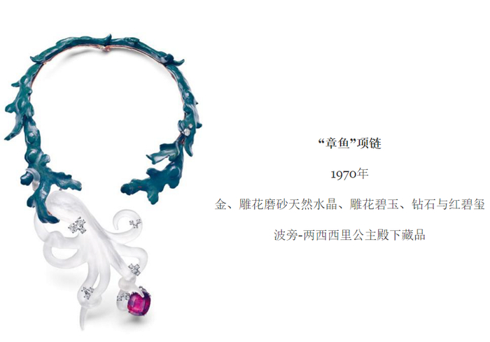 除了植物与天体之外,CHAUMET的自然主义世界还包含诸多动物作品。比如,这条项链是男爵瓦伦提诺·阿德比(Valentine Abdy)赠予其新娘玛蒂尔德·德·拉·菲特(Mathilde de La Ferté)的一件结婚礼物。该项链由雕塑家罗伯特·勒莫尔纳(Robert Lemoine)进行修缮,呈现出类似于艺术家萨尔瓦多·达利(Salvador Dali)或是梅拉·奥本海姆(Meret Oppenheim)的超现实主义风格。激情洋溢的爱情,在这样一幅画面里变得生动:一条章鱼,它紧握海藻花环,触手则抓住一颗红碧玺。而这件作品,也曾在2017年的故宫大展“尚之以琼华——始于18世纪的珍宝艺术”呈现。