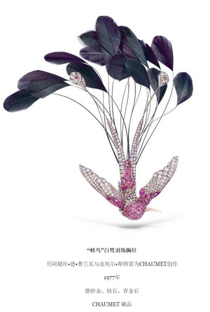 蜂鸟又叫天堂鸟。这枚精巧的蜂鸟造型饰品既可作为胸针佩戴,也可与一根羽毛搭配,化身为一款羽饰钻冕。蜂鸟全身密镶红宝石与钻石,以构思巧妙的镶嵌方式逼真再现了每一根羽毛,整体造型轻盈灵动,完美捕捉住天堂鸟飞翔时刻的精巧与优雅。