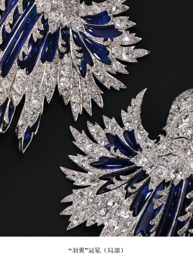 毛排布形态构成纤长羽翼,但截取其中细节部分查看,作品中又隐藏着近似蕨类植物叶片的形象。把植物元素混用进动物主题,让佩戴者拥有更广义上的自然。值得一提的是,“羽翼”冠冕特别采用了可转换式工艺,既是胸针,也可转变为冠冕佩戴。