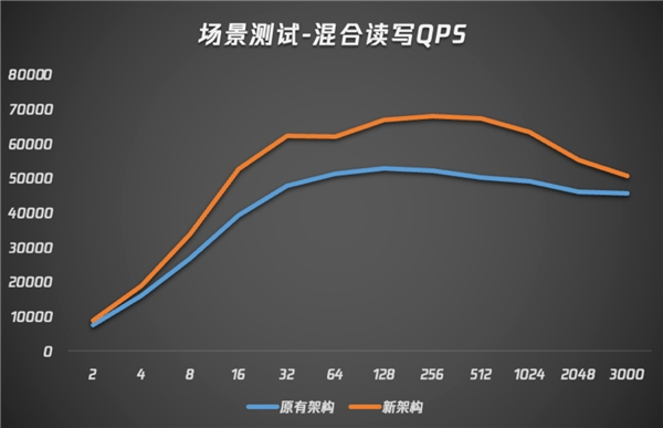 在混合读写场景下,低线程数时搭载了新一代内核的腾讯云数据库MySQL的QPS增幅较大,最高时达到近20%的提升。