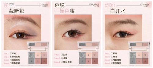以粉紫为主色的撞色妆容则倍显古典美人的气质;大面积使用蓝灰银,则有一种柔妹跳脱常规的惊喜感。