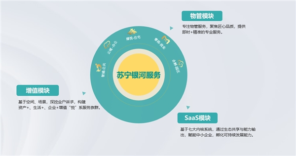 在打造品牌体系方面,苏宁银河不断扩充自身品牌体系。围绕城市拓展、业务协同、卓越品质,在一个主品牌基础上,苏宁银河针对不同业态、业务需求,完成臻悦、云域、企孵、睿商、智城五大业态品牌注册,资产、车场、工程、环境等增值业务品牌体系的规划、注册,以及党建、物业学苑、社区文化等多维度的品牌体系的建设规划,通过品牌裂变,最终勾勒城市共生、业务共荣、业态共轨的发展新格局。