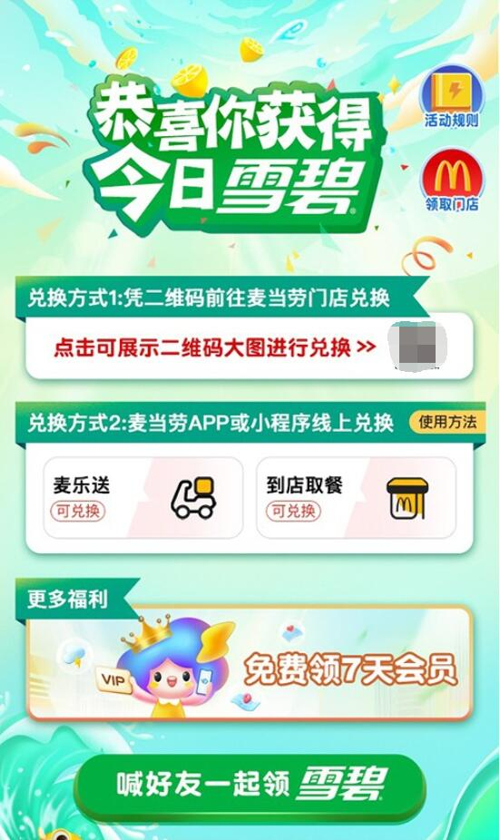 有别于往年用户仅能凭二维码到门店核销的传统兑换方式,今年35度计划首次接入麦当劳线上点餐、外卖系统,更加方便大众核销雪碧,吸引更多人参与。