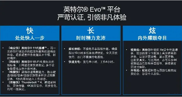 随着社会的进步,越来越多的人选择将笔记本作为主要的办公工具。很多对笔记本研究不太多的用户打开笔记本发现这个“Evo”的标贴。说到Evo平台认证,先说说Evo的来源。2019年8月,英特尔在发布10nm处理器的同时,也发布了一个名为雅典娜计划,一线万联:英特尔 EVO 认证。而英特尔 EVO 认证必备雷电 4 接口。同时Evo平台认证针对广大用户的真实世界体验做大了全面优化,致力于让轻薄本满足快速唤醒、高性能、长续航、极致的连接性等特点,以应对各类工作负载。