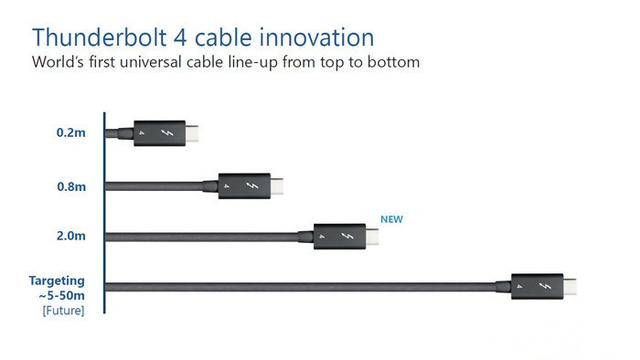 此前支持Thunderbolt 3的线缆共有0.2m和0.8米两种可选,而在Thunderbolt 4发布后,英特尔也提供了2m的通用线缆,以适应更多使用场景。据了解,未来还将推出5m甚至50m的Thunderbolt 4超长线缆,在满足高带宽的同时,也彻底做到不受距离所限制。具体来说,更长的线缆也是为了适用更多的应用场景,例如在会议室内能够更加从容地将Evo认证的轻薄本与电池、投影仪相连接,做到快速分享屏幕内容。