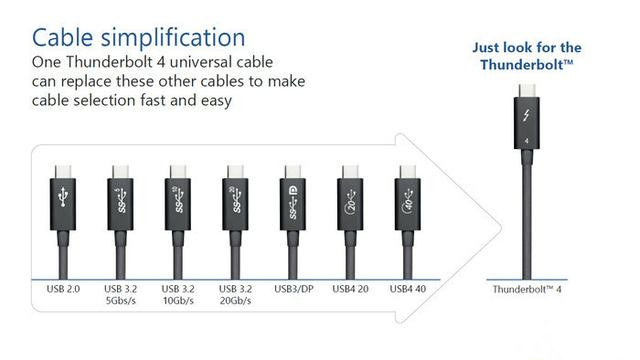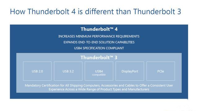 Thunderbolt 4 构建于 Thunderbolt 3 的创新基础之上,能提供真正的通用线缆连接体验。Thunderbolt 4 提供 40 Gbps的带宽,通过单个连接进行数据、视频传输和供电。Thunderbolt 4 是符合广泛的行业标准规范,包括 USB4、DisplayPort (PCIe,并且完全兼容前代 Thunderbolt 和 USB 产品。具体来说Thunderbolt 4 认证要求包括: