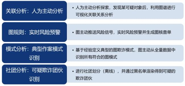 关联分析、图规则、模式分析,还有社团分析,这 4 点是覆盖了实时、准实时还有事后的三个方式,既是图谱用于反欺诈的主要功能,也是我们目前的优势能力,我们很多家客户目前都在应用。