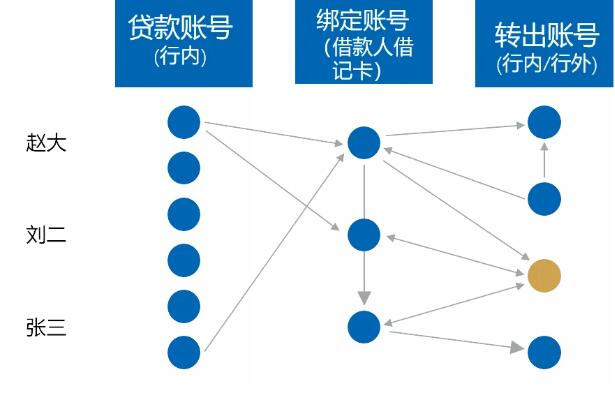 接下来可以展示一下具体手法,比如放贷后直接流入黑名单账户,或者解除关联后从自己账户转移到非自己名下,但可能是实际控制的一个账户,再往楼市、股市这些敏感行业投资理财。这些都是可以通过图谱,结合资金的具体形态来分析的,因为这些行为在图谱上会展示出一个非常明显的发散或归集。