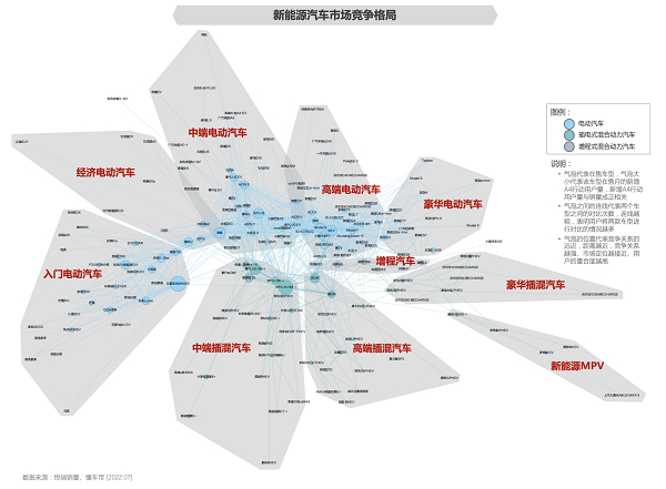 新能源汽车相关品牌也逐渐构建了新的竞争圈。 报告显示,最初的新能源品牌竞争圈,主要包括特斯拉、蔚小理等中国新势力品牌等。此后,传统车企纷纷将自己的新能源汽车业务分离出来,成立新的独立新能源品牌。如比亚迪通过战略转型,全面停止燃油汽车生产,成为当下新能源品牌竞争圈的核心。