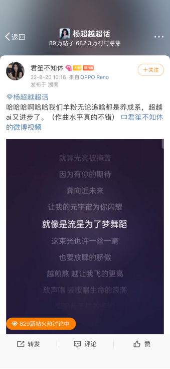 在“超越AI”唱的一首粤语歌《漫步人生路》中,AI学习和还原了杨超越的音频特征,已经明显脱离了“人工感”、“机械感”;到《唐潮》中,“超越AI”又轻松驾驭rap等多种不同演唱类型;而此次“超越AI”在《元宇宙》中的表现也更进一步,更丝滑的声音技巧,让粉丝们直呼“无论追啥都是养成系,超越AI又进步了”!