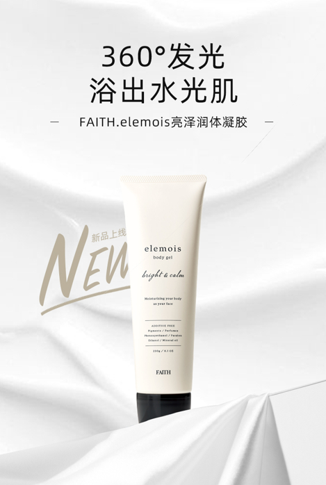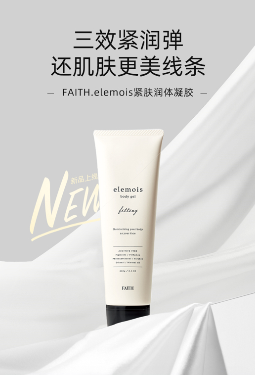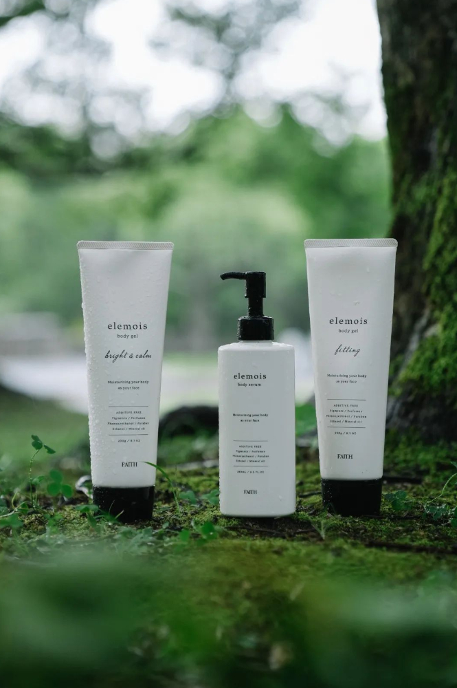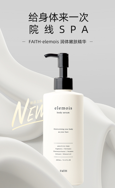 与FAITH妃颐思胶原护肤系列以及养肤彩妆系列相同,elemois身体精华系列坚持用护肤理论来打造,用精华标准呵护全身肌肤。目前,该系列产品联合京都大学、东京理科大学旗下L.V.M.C研究所共同研发,主推产品为润体嫩肤精华、紧肤润体凝胶以及亮泽润体凝胶。