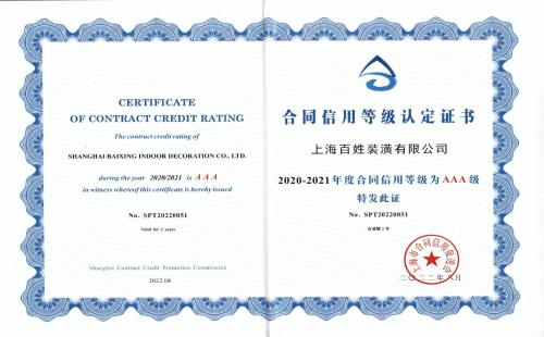 日前,上海百姓装潢有限公司荣获上海市合同信用促进会评选的“2020-2021年度上海市守合同重信用企业”,并授予信用等级最高的AAA级,这是百姓装潢连续二十年被评为上海市“守合同重信用”企业。