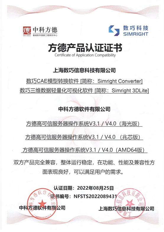 近日,数巧国产云化CAE软件产品顺利完成了首批与中科方德国产操作系统的深度适配认证,双方就软件产品与操作系统通力兼容达成互认,数巧科技获方德产品认证证书。这标志着数巧自主可控云化CAE产品可完全适配国产主流操作系统。