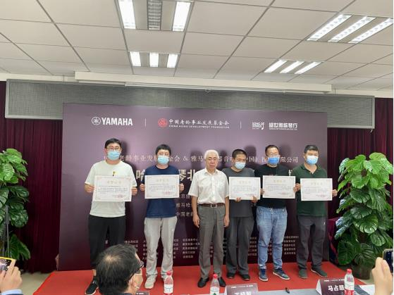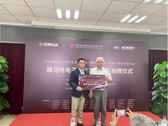 中国老龄事业发展基金会文化养老公益行动办公室主任马占顺为雅马哈乐器音响(中国)投资有限公司颁发捐赠牌(图左“雅马哈电子键盘企划科科长唐浩”)
