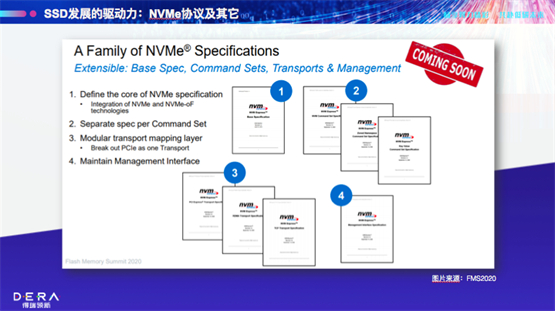 其次,SSD内生的一些相关标准,同样在驱动SSD发生变化。比如近年来发展迅速的NVMe协议、新的Command Set指令集和transport标准,都做了一些新的扩展定义,在NVMe Basic Spec之外,定义了三类Command Set,除了常用的NVMe Command Set,以及近两年出现的ZNS Command Set和KV Command Set,Transportation有基于原生的PCIe标准,而后又出现基于RDMA和TCP的标准。同时,NVMe的MI协议也越来越普及,从协议功能角度来看,它也是SSD发展的一大推动点。