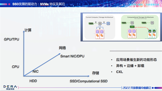 在架构设计时经常提到存算分离,也就是计算层与存储层解耦,使得彼此在扩缩容时互不影响。近两年存算一体、近存计算的概念火热,在存储体系中增加算力,在离数据最近的地方进行计算,最大的好处就是解决了加速运算的问题。康雷提到,专用的计算存储SSD在数据中心的实用性和通用性并不是非常好。对一般的开放数据中心来说,成本增加后的计算存储,可能促进A业务性能提升,但对B业务却没有任何价值体现。同时,一些新趋势,比如GPU/TPU和DPU,也在争夺服务器上的计算话语权。以前我们认为可能有三个功能适合落盘去做,现在来看可能两个功能都可以被GPU、DPU来实现,而无需落盘。同时还有异构、边缘等带来了一些新的冲击,而CXL这样比较有颠覆性的协议,可以把服务器上的条块化内存组织起来,在小范围内形成一个内存的池化,具有诸多优点。