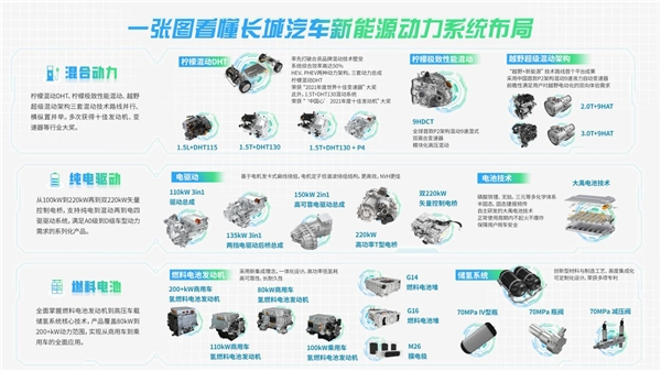 加速汽车电动化转型,抢占新能源技术制高点,这在长城汽车不是一句口号,而是一种坚定的践行。在新能源动力方面,除了混动,长城汽车在纯电动、氢能技术领域也进行了深入布局,构建了涵盖混动—纯电动—氢燃料动力的新能源动力系统。