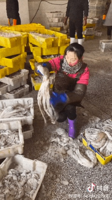 去年冬天很冷,室外温度零下十几度,一次直播时正下着大雪,鱼虾结冰冻成一坨。她用手掰不动,只好拎了一桶凉水把冰坨坨冲开,再用冻僵的双手一一展示着产品。直播结束后,有位顾客私信要她的地址,要给她寄冻疮膏。