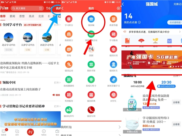 第二步:在右上角“我的”页面上,点击进入“强国城”;