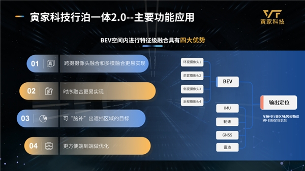 BEV是与环视领域内的鸟瞰图有一定相似性,但BEV范围更广,简单理解即是把自动驾驶关键感知区域车辆前向与车身环视范围一同投影到立体空间内。寅家科技行泊一体2.0会将前向主摄像头的视觉也囊括到整个BEV的环境下,同步将所有摄像头、车身原点坐标进行相对统一的坐标轴虚拟化,同时还会加入时间轴信息。这样一来,在横向视角上能做到更加远距离的跟踪,对于横穿物体具有更智能的跟踪优势。该图既可捕获静态元素,如道路和人行道;也可捕获动态目标,如汽车和行人,大大提高NOA的安全性。