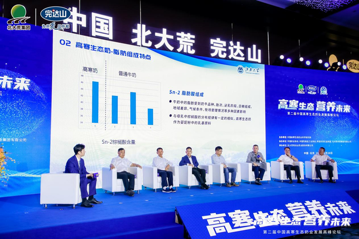 北大荒完达山乳业积极发挥区域核心优势,依托“龙江沃土、黄金奶仓、生态北大荒”,专注于高寒生态奶发展,巩固了其在市场中的竞争地位。高寒生态提升了乳品营养,体现优质乳价值。江南大学教授王兴国在今年第二届高寒生态奶业发展高峰论坛上表示,高寒生态奶的“优”,要通过量化的指标来体现。通过比较高寒生态奶和在非高寒环境下孕育的普通牛奶,主要差异在于sn-2脂肪酸和sn-2棕榈酸甘油三酯的含量。首先,高寒生态奶中sn-2棕榈酸甘油三酯的平均含量比普通奶高15%左右,sn-2棕榈酸甘油三酯是母乳中主要的甘油三酯类型。通过Meta分析表明,sn-2棕榈酸酯能增加婴儿体重、骨矿物质含量以及降低粪便中皂的形成,从而可以减少婴儿便秘发生。
