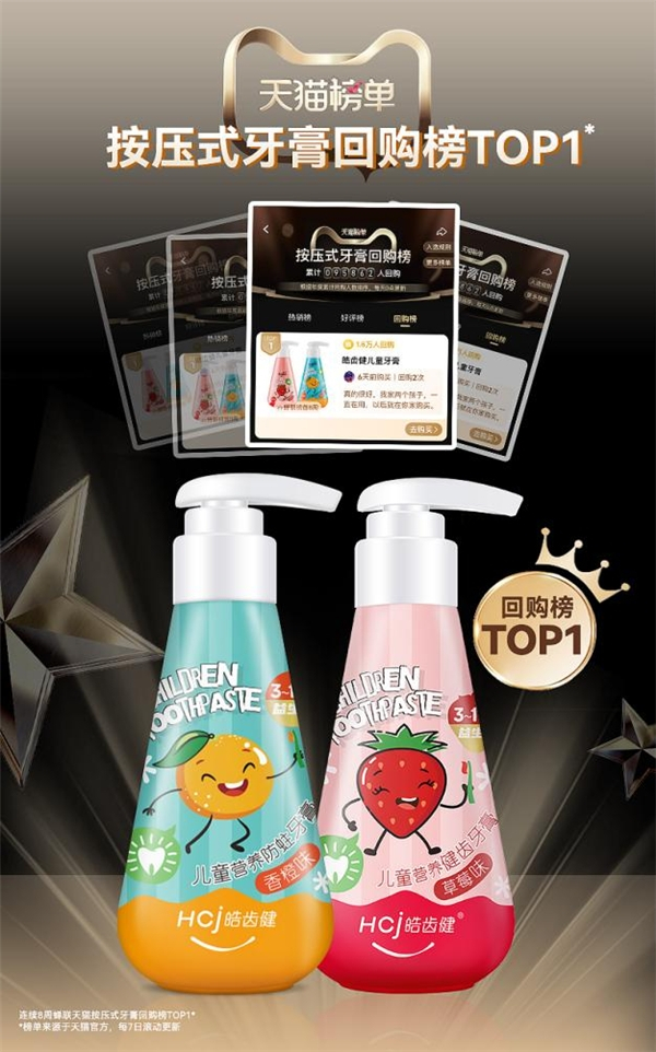 皓齿健作为国货品牌,重视夯实品牌口碑,为成为家长们可靠的选择,一直致力于在儿童口腔护理方面不断探索创新,儿童营养系列牙膏自从上市以来,多次创下电商平台销售新高,荣登天猫按压式牙膏回购榜,成为众多宝爸宝妈们心中优选。