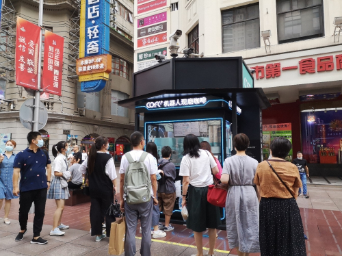 近日,cofe+咖啡机器人成为上海现象级网红。在寸土寸金的天下第一街——上海南京路步行街,东西两端,路中央惊现了两部cofe+全智能机器人现磨咖啡亭,排队购买过cofe+机器人咖啡的王先生表示:最早从朋友圈注意到这个机器人咖啡亭,太厉害了,机器人臂做咖啡的过程看起来十分科幻,没想到我们国家的机器人科技已经走进日常生活了。