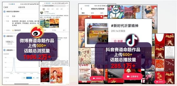 赛事活动历时六个月,最终收获常规赛道8000+组创意作品,更有120位校园大使为“新时代沂蒙精神”倾情代言,抖音、微博赛道#新时代沂蒙精神#话题流量持续高涨,平面海报、短视频、社交推文……一个个奔腾跳跃的流量“黑马”,掀起关于学习沂蒙精神的“打卡热”。