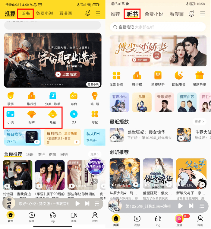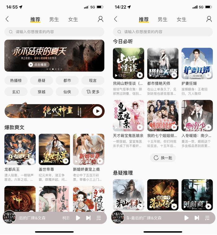 生活中的很多时候,长音频都以伴随式收听的方式陪伴在我们身边。比如,当你在上下班的路途中,是否想听点什么来排解漫长的通勤时光?有声小说就可以帮你解决。进入到有声小说频道,可以看到众多热门网文、影视作品、文学名著、动漫等不同种类的有声书、广播剧,还有备受欢迎的都市玄幻、悬疑推理等男频文和言情类、穿越类等女频文。