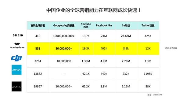 中国企业的全球营销能力正在快速成长,已经诞生了一批具有代表性的企业,比如SHEIN、万兴科技、大疆、安克、ZAFUL,大家在官网全球排名、安装量、海外社交媒体粉丝量都做的非常不错。