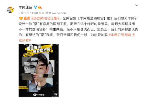 此外,丰网速运还借势发起了全行业的国潮共振行动,以微博话题#丰网只管潮前 全程热爱#为支点,并发布全网设计国潮工服#热爱助燃官征集#活动,让每个用户深度参与国潮工服的征召活动。当天明星设计师张彦与微博博主“章解放、EVA濛哥、动脉影、摄影师Sally”四位头部达人应征成为热爱助燃官,还有美妆、文化、穿搭、摄影等多类头部博主应声而动,为国潮工装贡献灵感,以点带面,在全网燃起了一股快递国潮热。