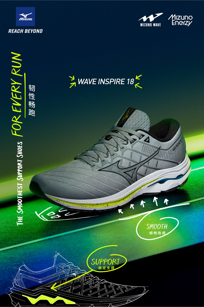 如果你喜欢脚踏实地的跑感,又或者你有足外翻的情况,INSPIRE 18就是你碗里的菜。INSPIRE 18延续前代,采用MIZUNO WAVE双层扇形波浪片科技,针对足外翻人群,内侧较高,外侧较低的扇形设计,为跑者的双足提供牢固的支撑。