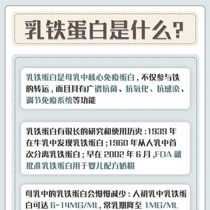 乳铁蛋白是铁结合糖蛋白,是属于先天免疫系统的成分物质,也是母乳中含量比较高的营养成分之一。具有调节免疫,增加体质功效。