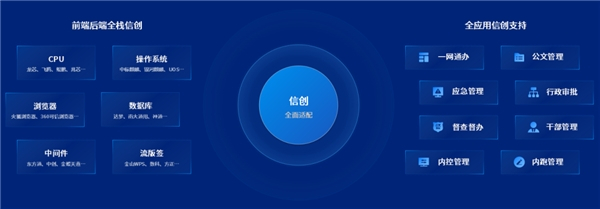据悉,微信创协同平台基于泛微e-cology9.0为技术框架起步,兼容国内40多种主流软硬件厂商产品,从底层CPU、服务器、中间件、数据库、浏览器到各种文档环境进行全面信创支持,是全生态链适配的信创协同办公平台。专注为党政机关提供集“公文管理、电子签章、统一工作中心、会议管理、督查督办、党建管理、建议提案管理等”应用于一体的信创协同办公解决方案,可满足各级党政机关及企事业单位信创办公需求,自主创新、安全稳定。