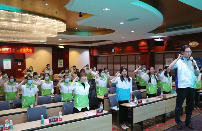 接下来,广东省药学会副理事长兼秘书长郑志华、PSM广东省工作总站站长吴新荣主任分别向PSM广东大参林(天宸健康)分站、广州工作站、佛山工作站授旗,并宣布PSM广东大参林(天宸健康)分站成立。郑志华秘书长、吴新荣主任、刘欣女士等分别为志愿者代表佩戴徽章,最后郑志华秘书长带领PSM广东大参林(天宸健康)全体志愿者宣读誓词。在座的志愿者们都感受到了身为药师所肩负的保障居民安全用药的责任。并愿意为保障社会安全用药,贡献一份自己的力量。