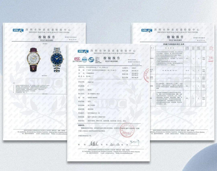 而在上市之前,它还要经受一次更严格的考验----送至权威机构(深圳市钟表质量检验中心)检测。每一次依宝诺腕表总能不负众肩、经受住重重考验,最终获得优等品的评级。